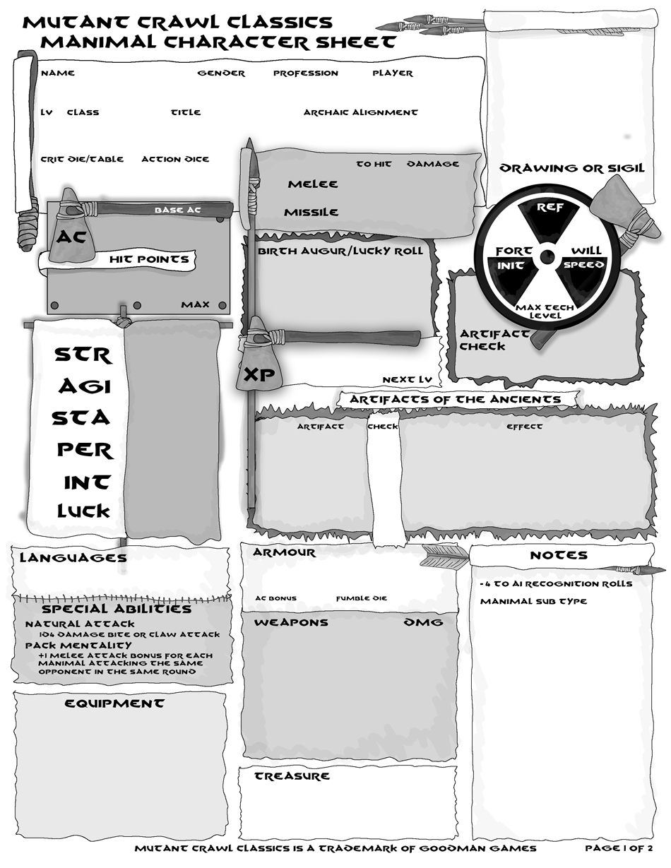 I recently created updated versions of the Mutant Crawl Classics (MCC) Character Generators for the seven MCC character classes: The Sentinel, the Rover, the Shaman, the Healer, the Mutant, the Manimal and the Plantient. The Character Generators are available on Artifacts of the Ancient Ones, a MCC Fan Site dedicated Jim Wampler’s fantastic post-apocalyptic role-playing game. I created PDF versions of the new MCC Character Sheets, which are available on the Character Sheets section of Artifacts of the Ancient Ones.